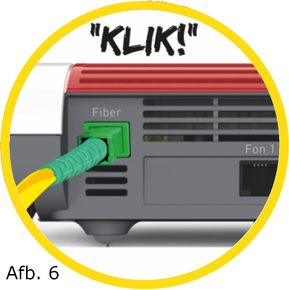 Pak het andere uiteinde van de glasvezel patchkabel. Dit is de groene aansluiting (SC connector) (afb. 3). Sluit deze aan door deze in ‘Fiber’ poort in de FRITZ!Box (afb. 6) te klikken. Je hoort een ‘KLIK’ wanneer deze goed aangesloten is.