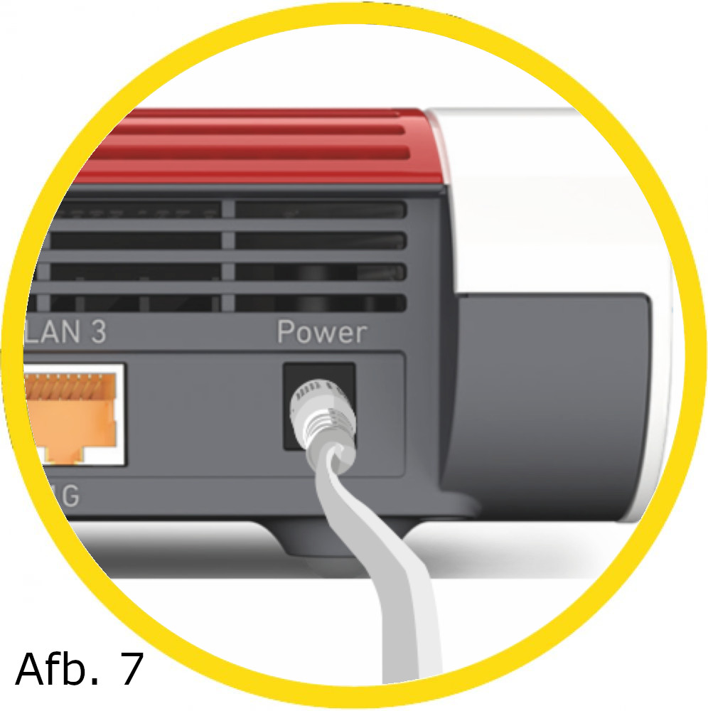 Sluit de stroomadapter aan op de FRITZ!Box (afb. 7). Steek vervolgens de stekker van de stroomadapter in het stopcontact.