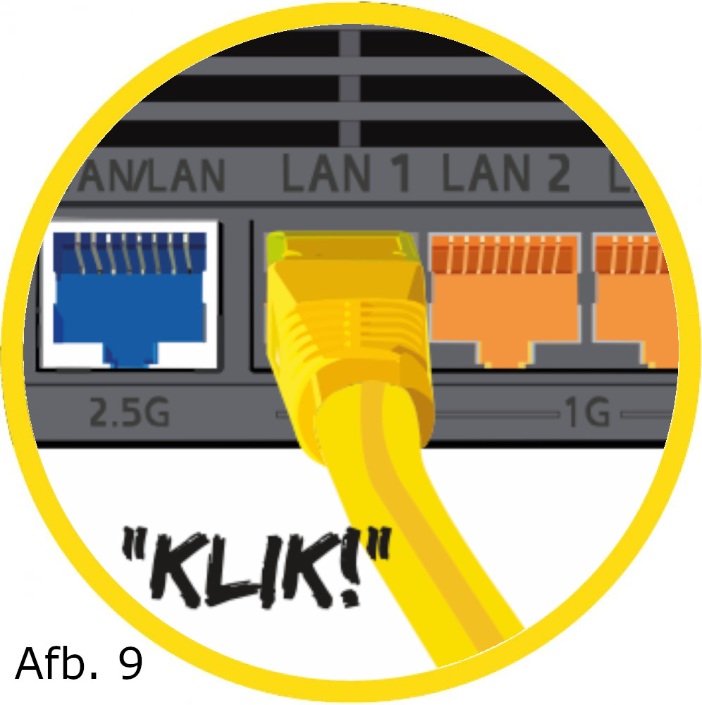 Optie 1: Plaats de netwerkkabel in een van de LAN-poorten van de FRITZ!Box (afb. 9). Plaats het andere uiteinde van de kabel in de LAN-poort van je computer of laptop. Hoor je een ‘KLIK’? Dan is de kabel goed aangesloten!