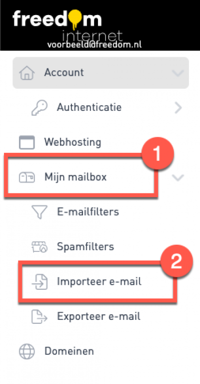 Klik op ‘Mijn mailbox’ (1) in het menu aan de linkerkant en hieronder op 'Importeer e-mail' (2)