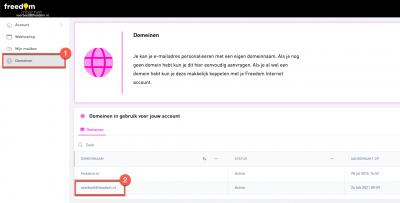 Klik in het menu op 'Domeinen' (1) en klik hierna op het domein van het e-mail adres waarvoor je het groeps e-mailadres wilt instellen (2).