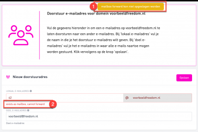 Krijg je een foutmelding met de tekst "mailbox forward kon niet opgeslagen worden" (1) of onder het invoerveld "exists as mailbox, cannot forward" (2)? Dan is het adres al in gebruik als mailbox of als alias. Je kunt dan het alias of e-mailaccount verwijderen om dit als doorstuur adres op te geven of je kunt proberen dit via e-mail filters in te stellen.