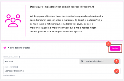 - Het doorsturen via een doorstuur e-mailadres is alleen mogelijk voor eigen domeinen die bij Freedom geregistreerd of gekoppeld zijn.
