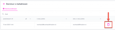 Je kunt het doorstuur e-mailadres verwijderen via de prullenbak knop op de overzichtspagina.