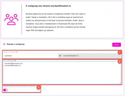 3 | Gebruik van buiten Freedom Internet toegestaan | Met dit schuifje bepaal je of e-mail adressen die niet bij Freedom staan een e-mail mogen sturen naar de e-mailgroep. Standaard staat deze aan en kan er vanaf externe e-mail partijen mail worden verzonden naar het ingesteld e-mailadres. Laat je dit niet toe, krijgt de verzendende partij een melding dat het e-mail adres niet bestaat. |