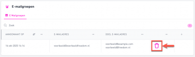 Je kunt het e-mailadres voor de e-mailgroep verwijderen via de prullenbak knop op de overzichtspagina.