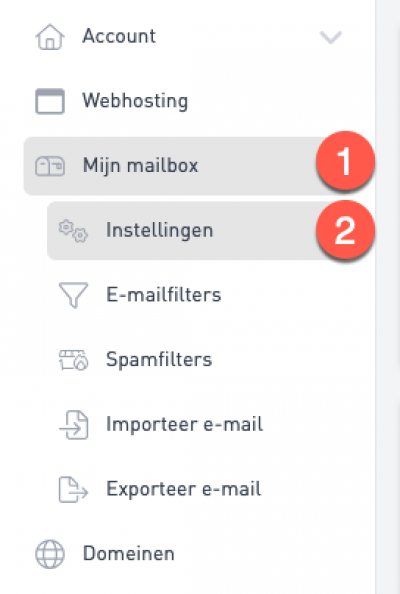 Klik op 'Mijn mailbox' (1) en hierna op 'Instellingen' (2)