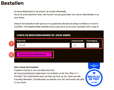 In het vak met het roze kader (1) tonen we welke snelheid Freedom maximaal kan leveren op jouw adres. Afhankelijk van de maximaal haalbare snelheid toont de website één of meerdere verbindingen.