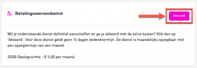 Wanneer je zeker weet dat je de 25GB extra opslagruimte wilt kopen, dan klik je op de knop 'Akkoord'.